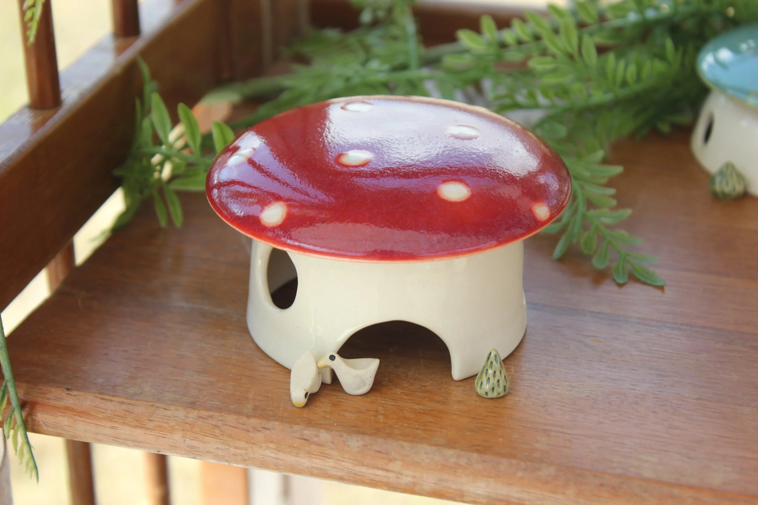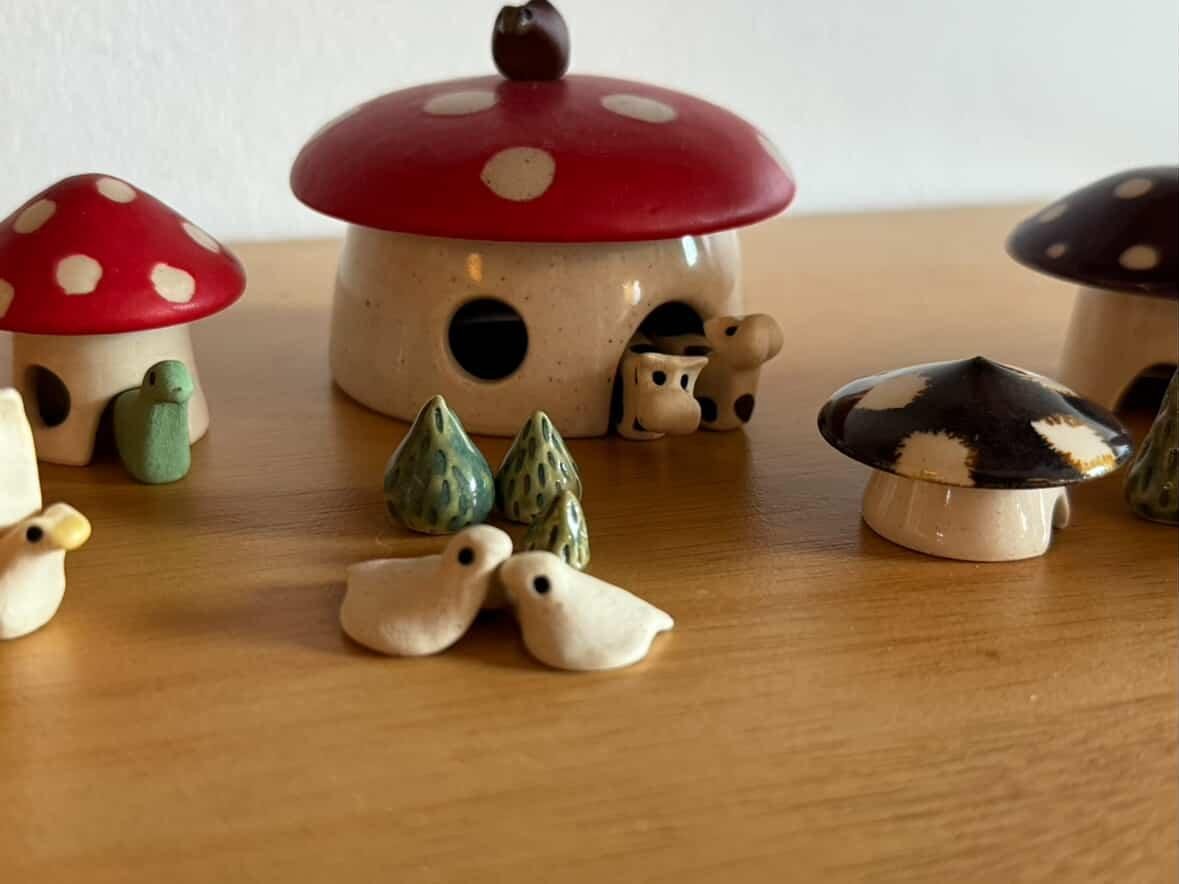 “I found Liza’s work by serendipitous chance at a fair and immediately fell in love… so did my two young kids! Her tiny ceramic mushroom homes, critters, acorns, trees, mini mugs, and more can be arranged into these magical little habitats and communities and invite this super cool creative interaction. Until seeing Liza’s work, I’d never seen anything that sparks this kind of inner-child joy for both kids and adults. Since then, I have collected more homes and critters and love building new little diorama with my kids. We have a basket in our front room full of her tiny creations at our little ones’ level, so we can all rearrange and create as we pass by. Everything she creates feels intentional, playful, and genuinely inspirational.”